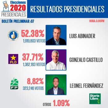 Con menos de un 18% de los colegios electorales pendientes por computar, al vencedor virtual de la contienda electoral de ayer domingo le sigue en segundo lugar Gonzalo Castillo, aspirante por el Partido de la Liberación Dominicana (PLD), con un 37.71% del sufragio y en tercer lugar continúa Leonel Fernández, candidato del Partido Reformista Social Cristiano (PRSC) y la Fuerza del Pueblo (FP) con 8.82% a su favor.