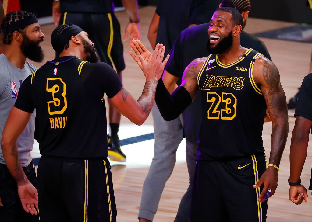 LAKE BUENA VISTA, FLORIDA - SEPTEMBER 20: LeBron James #23 of the Los Angeles Lakers celebrates with Anthony Davis #3 of the Los Angeles Lakers after shooting a three point basket to win the game over Denver Nuggets in Game Two of the Western Conference Finals during the 2020 NBA Playoffs at AdventHealth Arena at the ESPN Wide World Of Sports Complex on September 20, 2020 in Lake Buena Vista, Florida. NOTE TO USER: User expressly acknowledges and agrees that, by downloading and or using this photograph, User is consenting to the terms and conditions of the Getty Images License Agreement. (Photo by Kevin C. Cox/Getty Images)