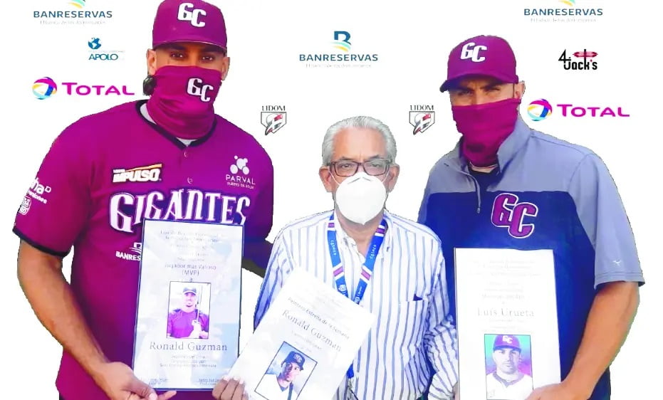 SAN PEDRO DE MACORIS.- Ronald Guzmán, inicialista de los Gigantes del Cibao y Luis Urueta, mánager de este conjunto, fueron premiados como Jugador Más Valioso y Dirigente del Año de la serie regular del actual torneo de béisbol profesional, respectivamente, por el programa Pelotero Estrella de la Semana.