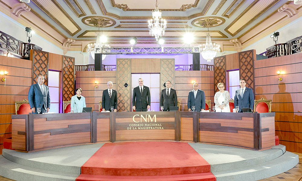 Conforme al artículo 178 de la Constitución, el CNM está conformado por 8 miembros: el presidente de la República, Luis Abinader; los presidentes del Senado y la Cámara de Diputados, Ricardo de los Santos y Alfredo Pacheco, respectivamente; un senador y un diputado que representen la segunda mayoría en las cámaras legislativas, en este caso Bautista Rojas Gómez y Víctor Fadul, respectivamente; el presidente de la Suprema Corte de Justicia, Luis Henry Molina; un juez de la Suprema Corte de Justicia, quien funge como secretario del consejo, que es Nancy Salcedo; y el procurador (a) general de la República, que es la magistrada Miriam Germán Brito.
