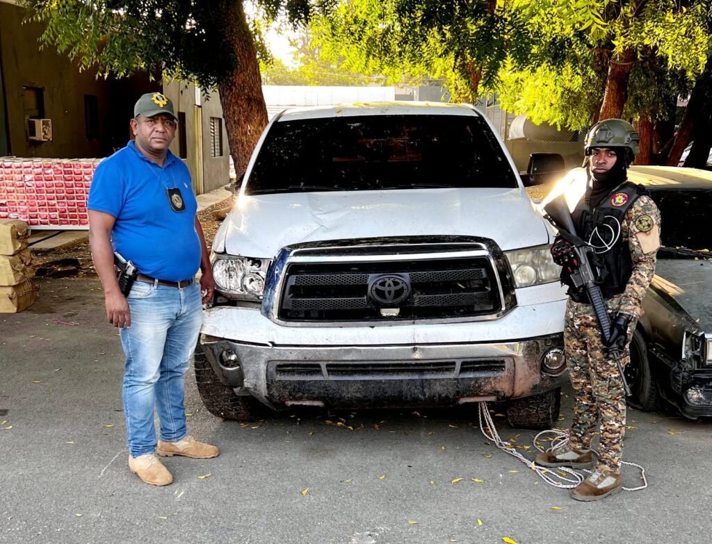 La camioneta detenida es una Toyota Tundra, color blanco, placa L363485, propiedad de Francisco Javier Núñez Peña alias Manchao, quien según informes de inteligencia es señalado como un contrabandista de la línea noroeste y de las costas de Puerto Plata.