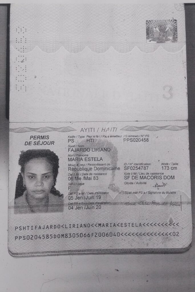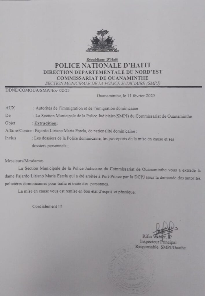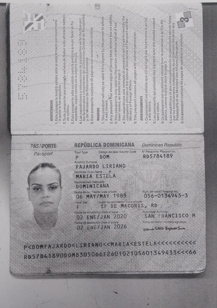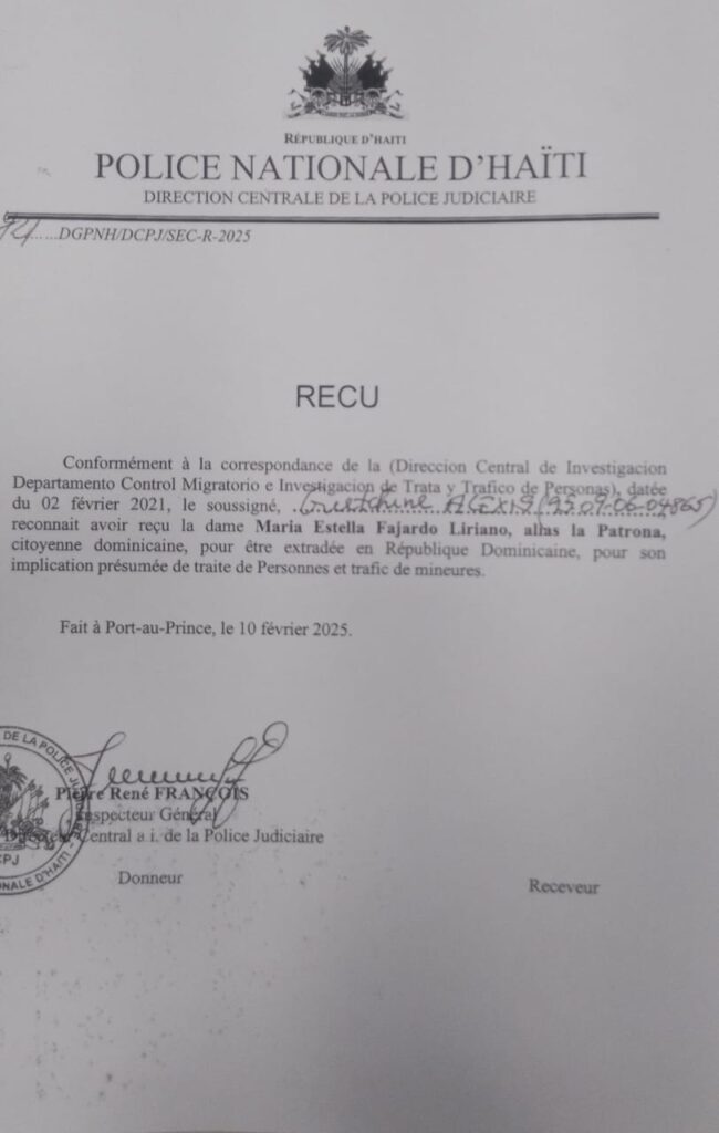 La detenida es la nombrada María Estela Fajardo Liriano, quien según las investigaciones es propietaria de un club en la comuna de Tabarre, Haití, denominado «La Patrona», la cual fue apresada en Puerto Príncipe, el lunes 3 de febrero del año en curso, a solicitud de las autoridades de la República Dominicana.