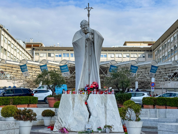 El altar, improvisado a los pies de una estatua de Juan Pablo en la que se Iee «No tengas miedo» frente a la entrada del centro médico, se ha colmado de flores, velas y muestras de afecto de personas llegadas de todo el mundo.