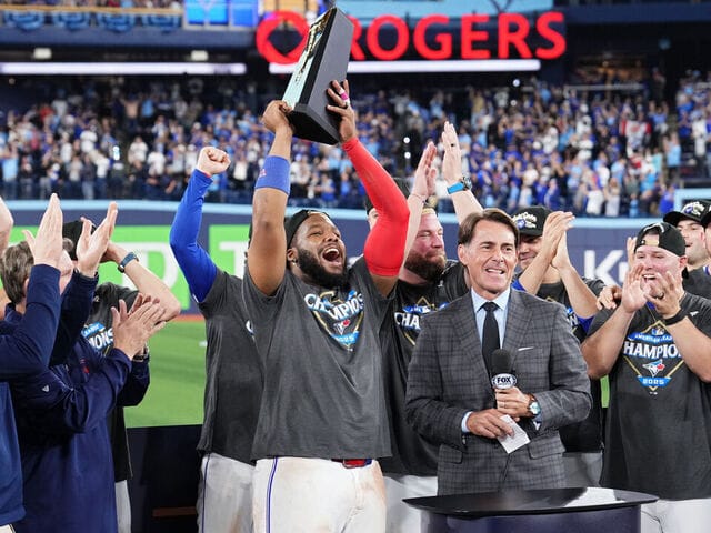 Significa mucho para Guerrero también. Se puede sentir su genuina conexión con esta organización y su afición. Al subir al podio, aceptando el Premio al Jugador Más Valioso de la ALCS, no solo la afición lo celebraba, sino también sus compañeros. En el momento en que el trofeo de la ALCS pasó del presidente Edward Rogers al presidente y director ejecutivo Mark Shapiro, sus compañeros lo empujaban hacia él.