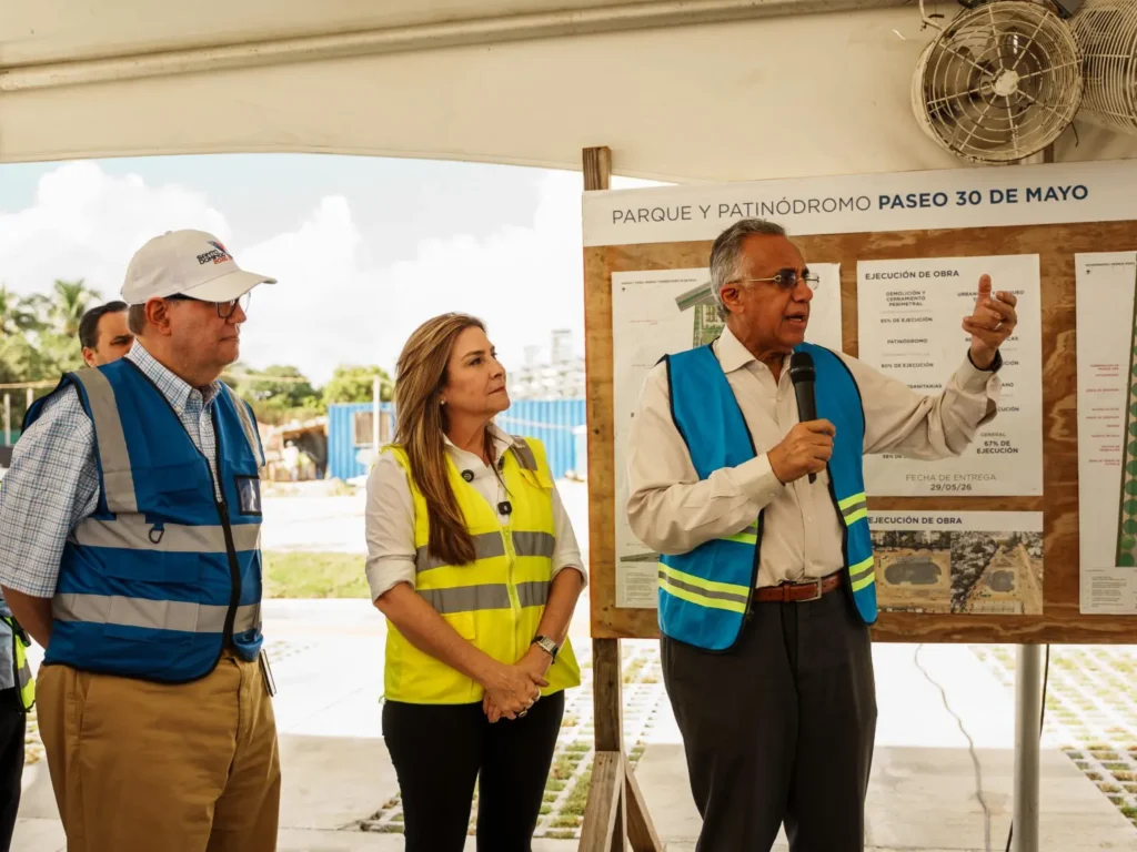 José Monegro, Felipe Vicini y Luisín Mejía felicitaron a Carolina Mejía luego de un recorrido por las obras Paseo 30 de Mayo y Malecón Deportivo, parte de las cuales serán escenario de los Juegos Centroamericanos y del Caribe Santo Domingo 2026.